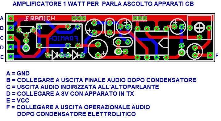 Questo modulino audio di 1 watt è stato concepito per essere utilizzato negli apparati con le bande laterali per l'auto ascolto. Come si può vedere dalle illustrazioni il circuito è anche munito di un piccolo relè che serva per commutare l'altoparlante dell'apparato sull'uscita audio del circuito quando la radio va in trasmissione e riportarlo sul finale di BF quando l'apparato va in ricezione. Sul link indicato di seguito è possibile vederlo in funzione su un Lafayette Typhoon al minuto 10:45 e al minuto 19:50: https://www.youtube.com/watch?v=_kMoBVTSn_Y